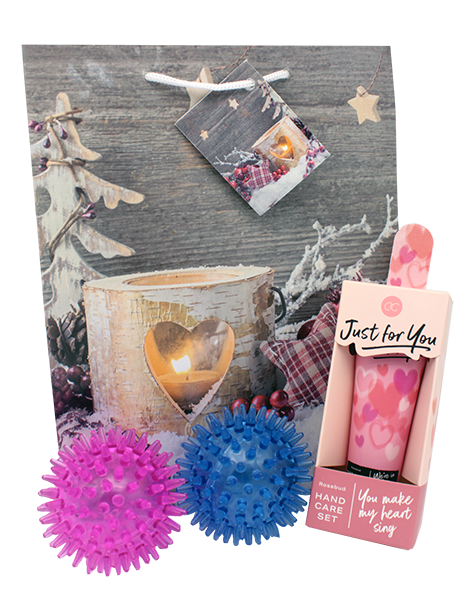 ein Massageball (blau/pink sortiert, nicht wählbar), verpackt in einer Geschenktüte.
